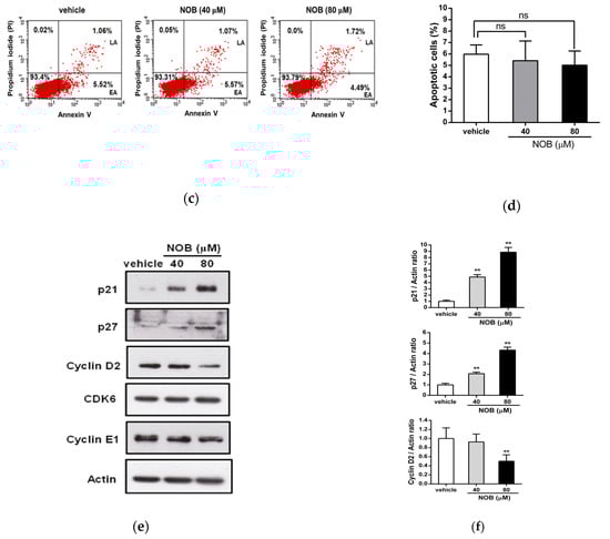 We next examined whether NOB could modulate the cell cycle progression. As shown in Figure 2a,b, NOB induced a significant increase in the G1 phase cell population, which was accompanied by a decrease in cells distributed in S phases. NOB did not cause a significant change in the sub-G1 phase (population of cell death). We further examined the effect of NOB on cell apoptosis in K562 cells. As shown in Figure 2c,d, the percentage of early or late apoptotic cells was not significantly altered in NOB-treated cells as compared to the vehicle-treated group. To investigate whether NOB could modulate the cell cycle regulators for controlling the G1/S phase transition, the protein levels of p21, p27, cyclin D2, cyclin E1, and CDK6 were analyzed. As shown in Figure 2e,f, the protein levels of p21 and p27 were markedly increased, while cyclin D2 was decreased in NOB-treated K562 cells. The levels of CDK6 and cyclin E1 were not significantly changed by NOB. These results suggested that NOB suppressed cell growth through cell cycle arrest in G1 phase but did not cause significant cell death in K562 cells.