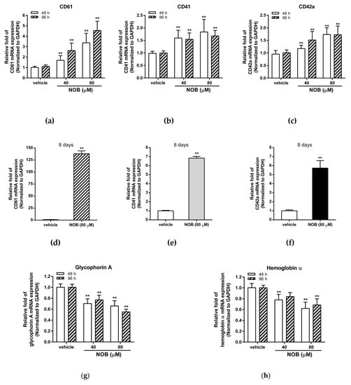 Effects of NOB on messenger RNA (mRNA) expression of cell differentiation markers in K562 cells. K562 cells were treated with vehicle or NOB (40 or 80 μM) for 48 h, 96 h, or eight days. The mRNA expression levels of (a,d) CD61 (b,e) CD41 (c,f) CD42a (g) glycophorin A (h) hemoglobin α were measured by Q-RT-PCR analysis and normalized to GAPDH control expression. The data represent the mean ± SD of three independent experiments. **p < 0.01 represents significant differences compared with the vehicle-treated cells.
