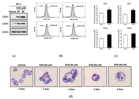 We further determined the effect of NOB on the protein expression of megakaryocytic differentiation markers. As shown in Figure 4a, Western blot analysis data showed that cells treated with NOB (40 and 80 μM) for 96 h could increase the levels of CD61 and CD41 protein expression in K562 cells. Furthermore, the levels of cell-surface marker proteins in NOB-treated cells were measured by flow cytometry analysis. As shown in Figure 4b,c the protein levels of markers CD61, CD41, CD42a, and CD42b were significantly elevated by NOB (80 μM) as compared with those in the control group (p < 0.01). Even eight days after the NOB treatment, the CD61 or CD41 proteins were still highly expressed in K562 cells (Figure S2a–S2c). While two erythrocytic differentiation markers, glycophorin A and transferrin receptor (CD71), were reduced (Figure S3a,b). These results indicated that NOB significantly induced the expression of megakaryocytic marker proteins in K562 cells.