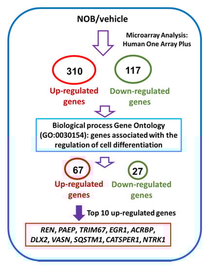 To further explore the mechanisms how NOB mediated the megakaryocytic differentiation of K562 cells, we investigated the differential gene expression in NOB-treated cells by human genome-wide microarray analysis. K562 cells were treated with vehicle or NOB (80 μM) for 48 h, and RNA expression profiles were analyzed using the Human OneArray system. Figure 5 illustrates the flowchart for the microarray analysis to identify differentially expressed genes in NOB-treated K562 cells. A total of 310 upregulated and 117 downregulated genes were detected in cells treated with NOB compared with the vehicle-treated group. Table S1 showed that 67 upregulated and 27 downregulated genes were identified by the gene ontology enrichment analysis related to cell differentiation (GO:0030154) in NOB-treated cells.