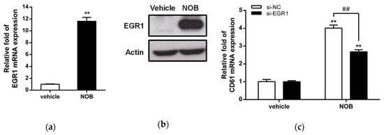 Table 3 showed the top 10 upregulated genes including REN, PAEP, TRIM67, EGR1, ACRBP, DLX2, VASN, SQSTM1, CATSPER1, and NTRK1. Among these genes, early growth response 1 (EGR1), a transcriptional regulator, has been reported to promote megakaryocytic and myeloid differentiation and to suppress leukemia tumorigenesis [32,33]. Then we asked whether the EGR1 gene is involved in NOB-induced megakaryocytic differentiation. As shown in Figure 6a, NOB (80 μM) treatment for 48 h increased EGR1 mRNA expression in K562 cells by approximately 11 folds when compared with the vehicle-treated group (p < 0.01). The EGR1 protein level was also increased by NOB (Figure 6b). To examine whether EGR1 plays an essential role during NOB-induced megakaryocytic differentiation, we examined the CD61 mRNA expression in NOB-treated K562 cells by specific siRNA knockdown of EGR1. As shown in Figure 6c, the level of CD61 mRNA in si-EGR1-transfected cells was significantly reduced by approximately 40% when compared with that of the negative control siRNA (si-NC)-transfected group in NOB-treated cells. These data indicated that knockdown of EGR1 expression attenuated NOB-induced megakaryocytic differentiation. These results suggested that NOB-induced EGR1 expression in K562 cells could drive the cells toward megakaryocytic differentiation.