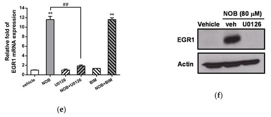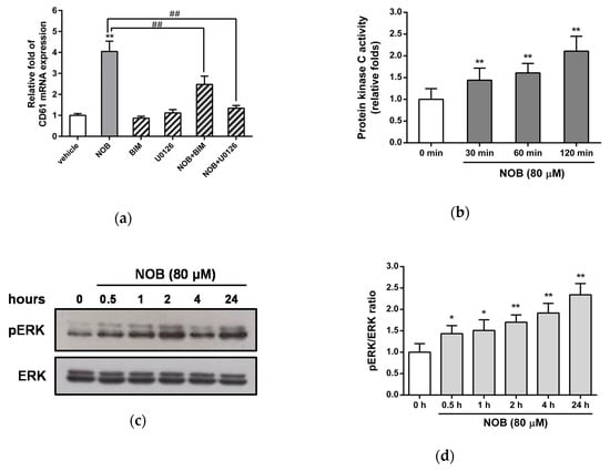 The MAPK/ERK and protein kinase C (PKC) pathways were reported to be involved in the differentiation of leukemia cells [34,35]. Thus, we further investigated whether NOB-induced megakaryocytic differentiation was dependent on activation of the PKC and MAPK/ERK pathways in K562 cells. Cells were pretreated with the PKC inhibitor bisindolylmaleimide I (BIM) or the MAPK/ERK kinase 1/2 (MEK1/2) inhibitor U0126 for 30 min followed by treatment with NOB (80 μM) for 48 h. As shown in Figure 7a, treatment of cells with BIM or U0126 alone did not significantly affect the NOB-induced CD61 mRNA expression. When K562 cells were cotreated with NOB and one inhibitor, the NOB-induced CD61 expression was significantly attenuated by BIM or U0126. The treatment of cells with the inhibitors SB203580 (p38 inhibitor), SP600125 (c-jun N-terminal kinase (JNK) inhibitor), or LY294002 (PI3K/Akt inhibitor) did not affect the NOB-induced upregulation of CD61 mRNA (Figure S3). Furthermore, we investigated the effects of NOB on the activation of PKC and the phosphorylation of ERK in K562 cells. As shown in Figure 7b, PKC activity was increased 2-fold after NOB (80 μM) treatment for 120 min compared with untreated control group. NOB treatment increased the phosphorylation of ERK1/2 protein from 0.5 h after treatment and lasted up to 24 h in K562 cells (Figure 7c,d). These results suggested that the PKC and MAPK/ERK pathways were activated in the NOB-mediated megakaryocytic differentiation of K562 cells.