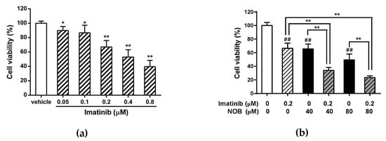 Effects of combination treatment with imatinib and NOB on cell viability of K562 cells. (a) K562 cells were treated with vehicle or imatinib (0.05, 0.1, 0.2, 0.4, and 0.8 μM) for 48 h. *p < 0.05 and **p < 0.01 represent significant differences compared with the vehicle-treated group. (b) K562 cells were treated with imatinib or NOB alone or co-treated with imatinib (0.2 μM) and NOB (40 or 80 μM) for 48 h. Cell viability was measured by MTT assay. The data represent the mean ± SD of three independent experiments. ##p < 0.01 represents significant differences compared with the imatinib and NOB-untreated group. **p < 0.01 represents significant differences compared with the imatinib or NOB alone groups.