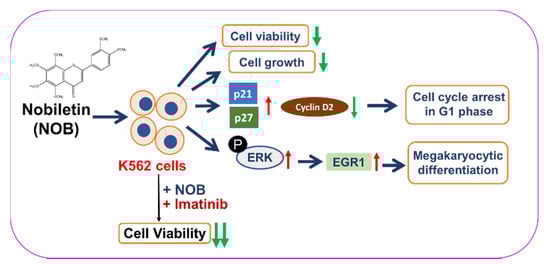 A hypothetical model for the anti-leukemic effects of NOB on human CML K562 cells. NOB reduces cell viability, inhibits cell growth, induces cell cycle arrest in G1 phase, and promotes megakaryocytic differentiation through activation of MAPK/ERK-dependent EGR1 expression in human CML K562 cells. Additionally, the combination of a conventional chemotherapeutic agent, imatinib, with NOB synergistically reduce the viability of K562 cells.