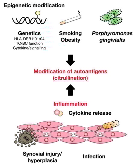 Factors contributing to rheumatoid arthritis (RA) development. Both environmental (smoking, obesity, as well as infections with certain pathogens such as Porphyromonas gingivialis) and genetic factors (epigenetic modifications, genetic polymorphisms influencing antigen presentation (e.g., the HLA genes HLA-DRB1*01/04), T- and B cell function, cytokine production, and signal transduction following immune cell activation) contribute to the development of RA. Moreover, also synovial injury and hyperplasia of synovial fibroblasts can contribute to the establishment of RA via the triggering of inflammatory conditions. Overall, these processes lead to the modification of autoantigens (mostly by citrullination) which generates neoepitopes by a loss of surface charge and an increased susceptibility to proteolytic degradation.