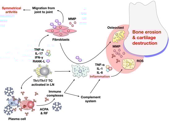 Macrophages activated in the pro-inflammatory milieu of the inflamed synovium in turn produce additional pro-inflammatory cytokines (IL-1β, IL-6, TNF-α) that contribute to increased inflammation by recruiting and activating other innate immune cells (e.g., neutrophils) to the site of synovitis. Activated neutrophils subsequently release high levels of oxidants, cytokines, and inflammatory agents including TNF-α, proteases, phospholipases, defensins, and myeloperoxidases at the site of RA in affected joints which further contribute to joint destruction [95,96].