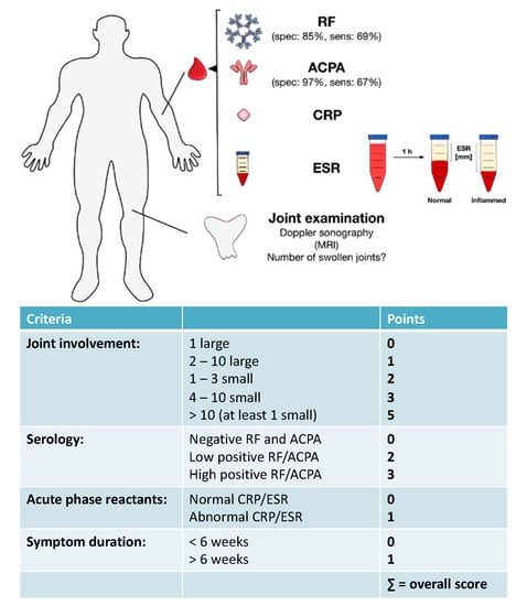 Typically, RA is diagnosed by a combination of patient’s symptoms, results of doctor´s examination, assessment of risk factors, family history, joint assessment by ultrasound sonography, and assessment of laboratory markers such as elevated levels of CRP and ESR in serum and detection of RA-specific autoantibodies (already discussed above) [7,129].