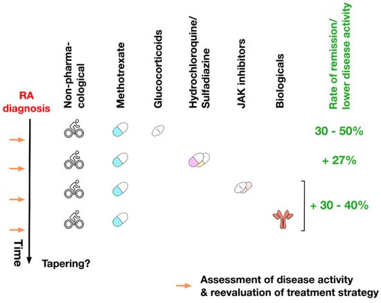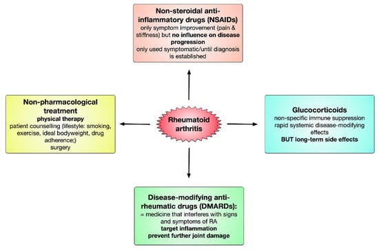 Fortunately, the repertoire of therapeutic drugs with benefit in the treatment of RA has grown steadily in the last 30 years. Currently, the available drug classes include NSAIDs, immunosuppressive glucocorticoids, and DMARDs. Drug treatment is typically supplemented by non-pharmacological treatment which includes physical therapy to sustain joint mobility and patient counselling to slow down disease progression (see Figure 4).