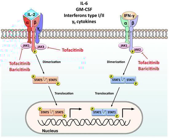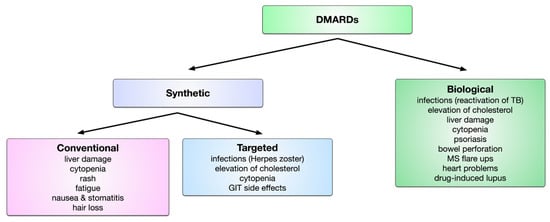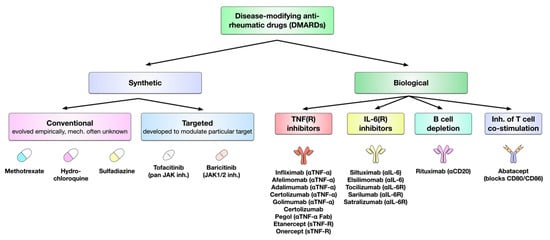 The available DMARDs are further subdivided into (1) conventional synthetic DMARDs (methotrexate, hydrochloroquine, and sulfadiazine), (2) targeted synthetic DMARDs (pan-JAK- and JAK1/2-inhibitors), and (3) biologic DMARDs (TNF-α inhibitors, TNF-receptor ® inhibitors, IL-6 inhibitors, IL-6R inhibitors, B cell depleting antibodies, and inhibitors of co-stimulatory molecules) (Figure 5). The following sections will discuss the different available DMARDs in more detail.