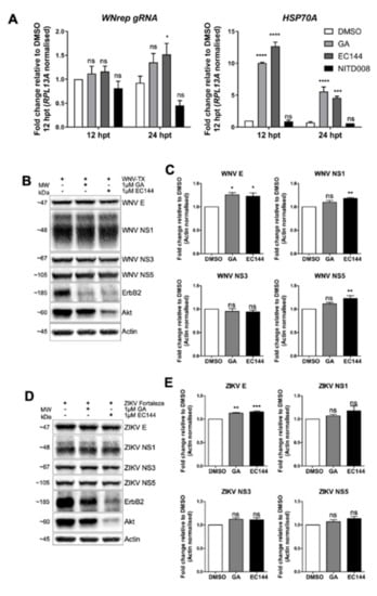 Flavivirus RNA replication and protein stability did not require HSP90 activity. (A) Huh7 WNV replicon cells were treated with HSP90 inhibitors GA and EC144, or nucleoside analogue NITD008 for 12 and 24 h to assess effects on RNA replication. Analysis of WNV replicon RNA (WNrep genomic RNA (gRNA)) revealed increased abundance following HSP90 inhibitor treatment, in contrast to reduced gRNA following NITD008. This was coincident with significant induction of HSP70A mRNA following HSP90 inhibitor treatment. Vero cells 12 hpi with (B,C) WNV or (D,E) ZIKV at MOI = 5 were treated with DMSO or HSP90 inhibitors for a further 12 h. (B,D) HSP90 inhibitors reduced Akt and ErbB2 abundance, and changes to viral proteins were not detected. Quantities of (C) WNV E, NS1, and NS5, as well as (E) ZIKV E were moderately yet significantly increased upon HSP90 inhibition. All data represent three independent experiments or are a combination of three experiments (mean ± SEM), with the exception of HSP70A mRNA quantification in (C) (n = 2). **** = p < 0.0001, *** = p < 0.001, ** = p < 0.01, * = p < 0.05, ns = p > 0.05. Two-way repeated measures ANOVA with Holm–Sidak’s post-tests (A), and one-way ANOVA with Dunnett’s multiple comparison post-tests (C,E).