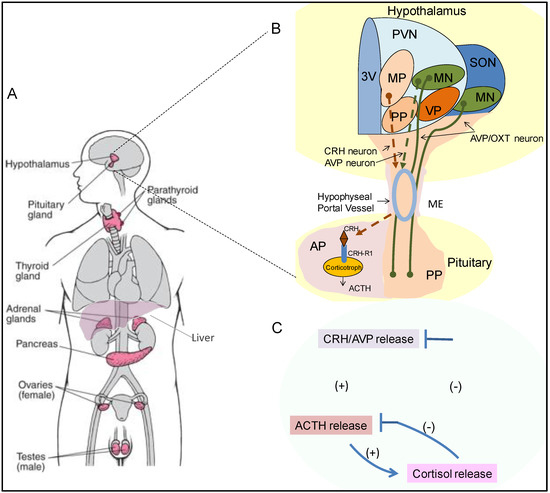Arguably, the most critical component of this three-tier system is the hypothalamic–pituitary–adrenal (HPA) axis which plays a vital role in adaptive stress responses and maintaining organism homeostasis. The hypothalamic neurons in the medial parvocellular (MP) subdivision of the PVN synthesize and secrete corticotropin-releasing hormone (CRH), which travels through the hypophyseal portal vessels to reach the anterior pituitary gland (Figure 1B). CRH then binds to corticotropin releasing hormone receptor-1 (CRH-R1) which is specifically expressed on anterior pituitary corticotroph cells to stimulate the release of ACTH into the systemic circulation. The principal target for circulating ACTH is the adrenal cortex, where on binding its cognate receptor melanocortin 2 receptor (MC2R), ACTH primarily induces glucocorticoid (GC) synthesis and secretion from the zona fasciculata of the adrenal gland [2]. GCs are pleiotropic hormones, involved in almost every cellular, molecular and physiologic aspect of the organism and regulate a broad spectrum of essential physiologic functions. GCs also fine-tune HPA axis activity by inhibiting hypothalamic CRH and anterior pituitary ACTH production and secretion in a negative feedback loop manner (Figure 1C).
