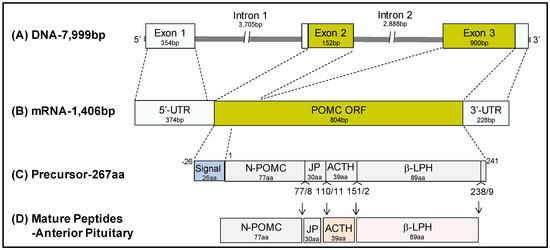 Gene structure and the bioactive peptides derived from the human proopiomelanocortin (POMC) gene. (A) The human POMC gene located on chromosome 2p23.3, spans 7999 bp on the reverse strand, and contains three exons and two introns. (B) The POMC transcript is processed into a 1406 bp mature mRNA with a 804 bp open reading frame (ORF). (C) The precursor protein of POMC contains 267 amino acids. The N-terminus 26aa signal peptide is cleaved during maturation, and the remaining region is further processed into several peptides in a tissue-specific manner. (D) In the anterior pituitary, POMC gives rise to a 16kDa N-POMC (also known as Pro-γ-MSH), joining peptide (JP), ACTH and beta-lipotropin (β-LPH).