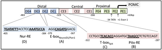 Depiction of transcriptional regulation of POMC promoter by corticotroph-lineage specific transcription factors. (A) E-box, NeuroD response element; (B) Pitx-RE, Pitx1 response element; (C) T-box, Tpit response element; (D) Nur-RE, Nur-factor binding element.