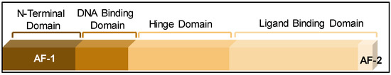 Schematic structure of a typical nuclear receptor (NR). The modular structure of NRs includes an N-terminal region, responsible for the ligand-independent activation function (AF-1), a DNA-binding domain, a hinge domain and a ligand-binding pocket responsible for the ligand-dependent activation function (AF-2).