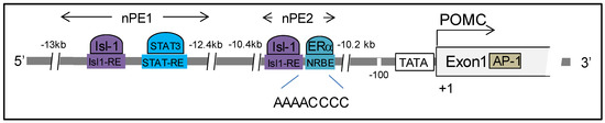Illustration of hypothalamic POMC transcriptional regulation. Distinct from the pituitary POMC promoter, two target sequences nPE1 and nPE2 on the POMC enhancer contribute to hypothalamic POMC neuron transcriptional regulation. AP-1, activator protein-1; Isl-1, ISL LIM homeobox 1; Isl1-RE, Isl-1 responsive element; NRBE, nuclear receptor binding element; STAT3, signal transducer and activator of transcription 3; STAT-RE, STAT responsive element.