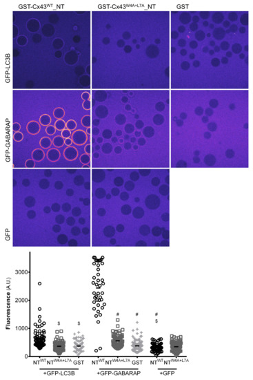 To further ascertain that the LIR motif present in connexins can interact directly with LC3 proteins and is thus a bona fide functional motif we proceeded to conduct in vitro experiments using recombinant glutathione S-transferase (GST) proteins fused to the amino terminal of mutant or wild type Cx43. Cx43 was chosen as the model for these assays due to being the most widely expressed connexin in the body and the main focus in connexin research. Given that Cx43 is an integral transmembrane protein, it is difficult to produce and isolate the full-length protein from bacterial or insect protein production systems, and thus only the amino terminal was used in these pull-down experiments. As a first approach, we carried out pull-down experiments in which recombinant GFP-LC3B and GFP-GABARAP were bound to GFP-TRAP beads to serve as bait. GST-Cx43WT_NT and GST-Cx43W4A+L7A_NT were used as prey in the experiment. As depicted in Figure S2, there is a very clear interaction between GFP-GABARAP and GST-Cx43WT_NT. Importantly, when the LIR motif is mutated, this interaction is substantially decreased. Unexpectedly, we were not able to detect any interaction between GST-Cx43WT_NT and GFP-LC3B in this assay, even though the full-length form of Cx43 readily interacted with GFP-LC3B when co-expressed in HEK293A cells (Figure 1A,D). To further confirm this in vitro data, we performed a microscopy based protein-protein interaction assay [16], in which the GST-tagged Cx43WT_NT or Cx43W4A+L7A_NT constructs are first bound to glutathione beads and subsequently incubated with recombinant GFP-LC3 or GFP-GABARAP. The intensity of fluorescence formed around the glutathione beads reflects the interaction between Cx43 and either LC3B or GABARAP. Representative images displayed in Figure 2 show a strong interaction between GST-Cx43WT_NT and GFP-GABARAP, which is almost entirely abolished in the LIR mutant (middle row panels). We were also able to detect a weak interaction between GST-Cx43WT_NT and GFP-LC3B, which is also abolished when the LIR mutant is used (top row panels). No interaction was observed when Cx43 coated beads were incubated with GFP alone.