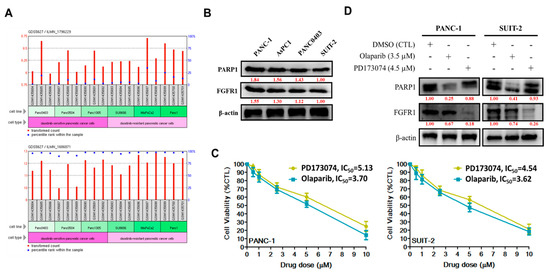 After our in-house mining of high-throughput gene expression data from public databases to understand the role of FGFR1 and PARP1 in PDAC, we performed computational analyses of the FGFR1 and PARP1 RNAseq expression profile in six PDAC cell lines that were classified according to their sensitivity to the FGFR inhibitor (FGFRi), dasatinib, for evaluating differential expression. Our results indicated that the cumulative median expression of FGFR1 (ILMN_1796229) mRNA was 1.802-fold (p < 0.05) higher in the poorly-differentiated dasatinib-resistant pancreatic cancer cells (SU8686, MiaPaCa2, and PANC-1) than in dasatinib-sensitive cells (PANC0403, PANC0504, and PANC1005) (Figure 1A, upper). Similar to FGFR1, PARP1 mRNA expression (ILMN_1686871) was approximately 1.81-fold (p < 0.01) higher in dasatinib-resistant pancreatic cancer cells than in dasatinib-sensitive cells (Figure 1A, lower). In parallel with mRNA assays, Western blot results showed that FGFR1 and PARP1 protein expression levels were 1.55- and 1.84-fold higher, respectively, in poorly differentiated FGFRi-resistant primary tumor PANC-1 cells than FGFRi-sensitive metastatic SUIT-2 cells (Figure 1B). We also observed a significant reduction in the viability of PANC-1 cells treated with 1–10 μM PD173074 (2%–71%; IC50 = 5.13 μM) or 1–10 μM olaparib/AZD2281 (10%–93%; IC50 = 3.70 μM). Similarly, treatment of SUIT-2 cells with 1–10 μM PD173074 or olaparib suppressed their viability by 7%–80% with an IC50 of 4.54 μM or 3.62 μM, respectively (Figure 1C). In addition, treatment with 4.5 μM PD173074 or 3.5 μM olaparib significantly downregulated the expression of PARP or FGFR1 protein, respectively, in PANC-1 and SUIT-2 cells (Figure 1D).