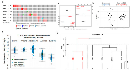 Enhanced FGFR1 and PARP1 expression characterize FGFR1 inhibitor-resistant pancreatic cells at mRNA and protein levels. Hence, we used the cBioPortal for cancer genomics (https://www.cbioportal.org/) to analyze FGFR1 and PARP1 expression and their functional association with selected markers of cancer stemness, resistance to therapy, and DNA repair by using the provisional TCGA pancreatic adenocarcinoma cohort (n = 185 patients/186 samples). Analysis of the TCGA cohort data revealed that patients with high FGFR1 mRNA expression exhibited high mRNA expression of the biomarkers of apoptotic DNA damage (PARP1), cancer stemness (aldehyde dehydrogenase 1, ALDH1A1), and multidrug resistance (ABCB1/MDR1), with concurrent absence of markers of DNA repair (RAD51 and H2AFX) (Figure 2A). We also observed a similar inverse correlation between the highly co-expressed FGFR1, PARP1, ALDH1A1, and ABCB1 mRNAs and the mildly expressed RAD51 and H2AFX mRNAs in the same TCGA cohort (Figure 2B, and Supplementary Figure S1). Next, multidimensional scaling factor analysis with k-means clustering for gene stratification into clusters based on previously indicated functional similarities between variables/genes showed the nesting of FGFR1, PARP1, ALDH1A1, and ABCB1 into one cluster and H2AFX and RAD51 into another cluster; with the two clusters being diametrically distant (Figure 2C,D). Because of the implication of FGFR1, PARP1, ALDH1A1, ABCB1, RAD51, and H2AFX in therapy response, we further performed gene-set expression-based cohort stratification into therapy responders and non-responders. We performed the principal component analysis of Collisson et al.’s E-GEOD-17891 AFFY_HG_U133_PLUS_2 dataset (n = 47) on the pervasive subtypes of PDAC and the difference in their response to therapy [16]. We observed that the Gene set_high patients with high FGFR1, PARP1, ALDH1A1, and ABCB1 but low RAD51 and H2AFX levels (n = 27) were less sensitive to erlotinib, a receptor tyrosine kinase inhibitor (RTKi), and gemcitabine, a chemotherapeutic nucleoside analog, than the Gene set_low patients with low FGFR1, PARP1, ALDH1A1, and ABCB1, but high RAD51 and H2AFX levels (n = 20) (Figure 2E and Supplementary Figure S2).