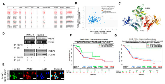 FGFR1 and PARP1 co-occur and directly interact with each other at the expense of RAD51/H2AFX signaling and with adverse prognostic implications. (A) Co-occurrence and mutual exclusivity analysis of FGFR1, PARP1, ALDH1A1, ABCB1, RAD51, and H2AFX in the TCGA pancreatic adenocarcinoma cohort. (B) FGFR1-PARP1 gene expression correlation in the TCGA pancreatic adenocarcinoma cohort. (C) Schrödinger’s PyMOL molecular graphics system-generated molecular docking of PARP1 and FGFR1. (D) PANC-1 and SUIT-2 cells were subjected to immunoprecipitation (IP) with FGFR1 (upper) or PARP1 (lower) antibody followed by Western blotting analysis with the indicated antibodies, with IgG serving as the control. (E) Interaction of PARP1 with fibroblast growth factor receptor 1 (FGFR1). Coimmunolocalization assays of PARP1 and FGFR1 in the PANC1 cancer cell lines expressing wild-type PARP1 and FGFR1. Kaplan–Meier plots showing the differential overall survival (OS) between (F) FGFR1-low and FGFR1-high samples or (G) PARP1-low and PARP1-high samples from the TCGA pancreatic adenocarcinoma cohort.