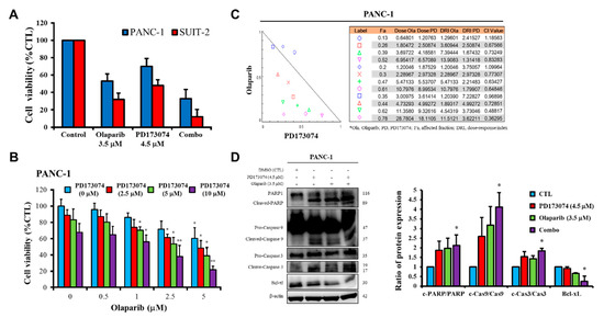 Olaparib-induced pharmacological inhibition of PARP1 synergistically enhances the therapeutic effect of PD173074. (A) Graphical representation of changes in PANC-1 and SUIT-2 cell viability when treated with 4.5 μM PD173074 and/or 3.5 μM olaparib for 48 h. (B) Effect of combining 2.5–10 μM PD173074 and 0.5–5 μM olaparib on the viability of PANC-1 cells. (C) Isobologram and drug combination index plot indicating synergy between different concentrations of PD173074 and olaparib. (D) The effect of treatment with 4.5 μM PD173074 and/or 3.5 μM olaparib on the expression level of PARP, cleaved PARP, pro-caspase-9, cleaved-caspase-9, pro-caspase-3, cleaved-caspase-3, and Bcl-xL proteins as shown by Western blot analysis. * p < 0.05, ** p < 0.01, (PANC-1: treated vs. CTL); * p < 0.05, ** p < 0.01 (SUIT-2: treated vs. CTL); CTL, control; Combo, PD173074 + olaparib combination therapy; Fa, fraction affected; CI, combination index; DRI, dose-reduction index.