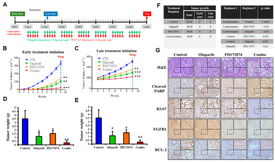 To examine the translatability of our in vitro findings, we assessed the efficacy of PD173074 and olaparib and investigated if initial tumor size affects the efficacy of drugs in vivo, and we used tumor xenograft mice models obtained by implantation of dasatinib-resistant PANC-1 tumorsphere cells. The mice were divided into two major treatment groups based on time of treatment initiation, namely “early start” group (n = 20, with treatment initiated on Day 3 of Week 1) and “late start” group (n = 20, with treatment started on Day 2 of Week 3 with tumor volume ≥ 200 mm3) (Figure 6A). In both early and late start treatment groups, the tumor-bearing mice that were treated with 50 mg/kg olaparib combined with 20 mg/kg PD173074 by intraperitoneal injection daily for five consecutive days per week until the end of Week 9 (n = 5 per group) exhibited significantly greater tumor growth inhibition than the PBS-treated control group (n = 5 per group) or those treated with either 50 mg/kg olaparib (n = 5 per group) or 20 mg/kg PD173074 (n = 5 per group) alone (Figure 6B,C). We also observed that the mice with early treatment initiation, regardless of regimen, showed greater inhibition of tumor growth than those with late treatment initiation. Consistent with the trend in tumor growth, the weights of the tumors obtained from mice in the early start group, regardless of regimen, were significantly lesser than those from mice in the late start group (average tumor weight: 0.937 ± 0.526 vs. 1.283 ± 0.817, p < 0.05). The mice treated with a combination of PD173074 and olaparib exhibited lesser tumor weights than those from the control subgroup or those treated with either PD173074 or olaparib alone (Figure 6D,E). In addition, we observed that compared with the late start group with 100% tumor xenograft growth, early treatment initiation caused a 35% reduction in tumor xenograft growth, as only 13 out of 20 mice grew tumors, regardless of the treatment regimen (Figure 6F). Furthermore, using immunohistochemical staining, we demonstrated that compared with the PBS-treated control group, tissues from tumors extracted from the BALB/c mice treated with PD173074 and/or olaparib exhibited significantly lower expression of FGFR1, ki-67, and Bcl-2 proteins, with concomitant upregulated cleaved PARP expression (Figure 6G).