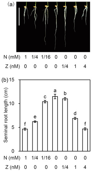 Effects of the N and Z treatments on rice seedling seminal root growth. (a) Phenotypic comparison of seminal roots of rice seedlings grown under different treatments. Scale bar is 5 cm. (b) Seminal root lengths under different treatments. In this experiment, germinated rice seeds were incubated in different solutions for four days, then photographs were taken, and the lengths of the seminal roots were measured. The data are the means ± SD calculated from 10 biological replicates. Significant differences (p < 0.05) are indicated by different letters (a, b, c, d, e, f). N, nitrogen; Z, zeatin.