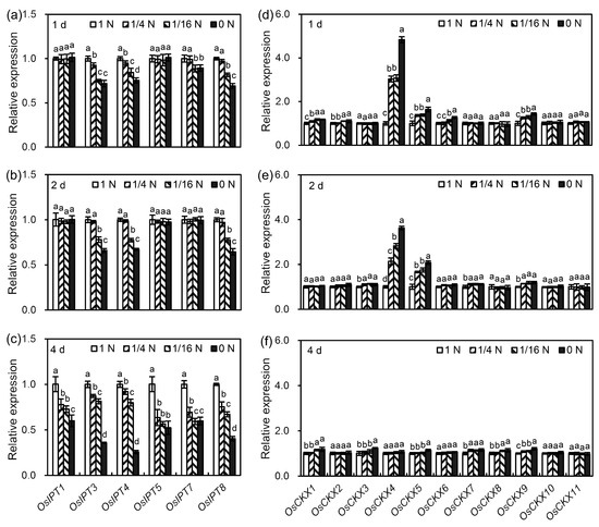 CK homeostasis is mainly controlled by CK biosynthesis and degradation [44,45]. In rice, six OsIPTs (OsIPT1, OsIPT3, OsIPT4, OsIPT5, OsIPT7, and OsIPT8) and 11 OsCKXs (OsCKX1–11) are the key genes modulating CK biosynthesis and degradation, respectively [46,47]. Thus, to investigate the mechanism by which N deficiency regulates CK content, the effects of N deficiency on the transcription levels of these six OsIPTs and 11 OsCKXs in rice seminal roots were investigated. On the one hand, N deficiency could reduce CK content by decreasing CK biosynthesis via the down-regulation of OsIPT genes. As shown in Figure 2a, after one day of treatment, of the six OsIPT genes tested, there were significant differences in the transcription levels between control and N deficiency treatments for four genes; the transcription levels of OsIPT3 and OsIPT4 were significantly down-regulated in response to all the N deficiency treatments, and the transcription levels of OsIPT7 and OsIPT8 were significantly down-regulated in response to the 1/16 N and 0 N treatments. After two days of treatment, the transcription levels of OsIPT3, OsIPT4, and OsIPT8 were significantly down-regulated by the 1/16 N and 0 N treatments (Figure 2b). After four days of treatment, the transcription levels of all six OsIPT genes were significantly down-regulated by treatment with ≤1/4 N (Figure 2c). These results suggest that N deficiency might reduce CK content by inhibiting CK biosynthesis via the down-regulation of OsIPT genes. On the other hand, N deficiency could reduce CK content by promoting CK degradation via the up-regulation of OsCKX genes. As shown in Figure 2d–f, OsCKX10 and OsCKX11 did not respond to N deficiency treatments, but the other eight OsCKX genes were up-regulated to different extents by different N deficiency treatments. Among the nine N deficiency-responsive OsCKX genes, OsCKX4 responded most strongly to N deficiency; the transcription level of OsCKX4 was up-regulated by more than 2-fold after one and two days of N deficiency treatment.