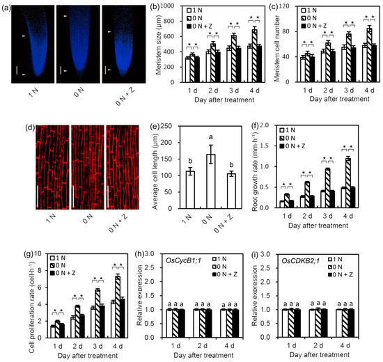 Effects of 1 N, 0 N, and 0 N + Z treatments on root phenotype, root growth rate, and meristem cell proliferation rate in rice seminal roots. Germinated rice seeds were incubated with a solution containing 0 N, 0 N + Z, or 1 N as a control for one day, two days, three days, or four days. (a–c) Comparison of root phenotype, meristem size, and meristem cell number between different treatments in rice seminal roots. The meristems of the rice seminal roots were visualized using 4′,6-diamidino-2-phenylindole staining and measured. Root meristem size was determined by measuring the length from the quiescent center to the first elongated epidermal cell. Meristem cell number in rice seminal root was expressed as the number of cortex cells from the quiescent center to the first elongated cell. (d,e) Comparison of mature cell phenotype and mature cell length between different treatments in rice seminal roots. The lengths of cells in the mature zones of the seminal roots were visualized using propidium iodide staining and measured. (f,g) Comparison of root growth rate and root cell proliferation rate between different treatments in rice seminal roots. Cell proliferation rate = root growth rate / mature cell length. (h,i) Comparison of the relative expression levels of root meristem cell division-related genes between different treatments in rice seminal roots. The relative expression levels of OsCycB1;1 and OsCDKB2;1 were used to indicate the meristem cell division activities in rice seminal roots. Bars = 100 μm for (a,d). Data are presented as means ± SD calculated from 10 biological replicates, and significant differences (p < 0.05) are indicated by asterisk or different letters (a, b). N, nitrogen; 1 N, 1 mM N; 0 N, 0 mM N; 0 N + Z, 0 mM N + 4 nM Z; Z, zeatin.
