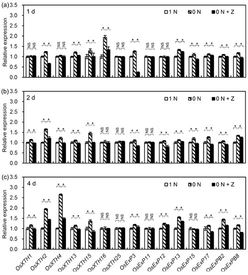 It has been reported that seven OsXTHs and eight OsEXPs are specifically expressed in rice roots [31,32], and that these root-specific genes play important roles in regulating root cell elongation in rice seedlings [31,32]. To clarify whether the N deficiency-induced decrease in CK increased the cell length in rice seminal roots by affecting the transcription levels of cell elongation-related genes, the effects of the control (1 N), N deficiency (0 N), and N deficiency + Z (0 N + Z) treatments on the transcription levels of the root-specific OsXTHs (OsXTH1, OsXTH2, OsXTH4, OsXTH13, OsXTH15, OsXTH16, and OsXTH25) and OsEXPs (OsEXP3, OsEXP11, OsEXP12, OsEXP13, OsEXP15, OsEXP17, OsEXPB2, and OsEXPB8) were investigated. After one day of N deficiency treatment, two-thirds of the root-specific OsXTHs and OsEXPs were up-regulated (Figure 5a). After two days of treatment, all root-specific OsXTHs and OsEXPs except for OsXTH16, OsXTH25, and OsEXP11 were up-regulated by the N deficiency treatment (Figure 5b). After four days of treatment, most of the root-specific OsXTH and OsEXP genes were still up-regulated under the N deficiency treatment (Figure 5c). At every time point, the effects on transcription were reduced in the presence of Z (Figure 5a–c). Taken together, all root-specific OsXTHs and OsEXPs except for OsXTH25 and OsEXP11 were up-regulated to different extents by N deficiency, and the up-regulation of these genes was inhibited by Z treatment. These results indicate that the N deficiency-induced decrease in CK content increased root cell length by up-regulating the transcription levels of cell elongation-related genes, including six OsXTHs and seven OsEXPs, in rice seminal roots.
