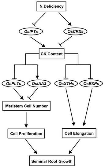 Rice seminal roots are the first roots to emerge from seeds after germination and are responsible for water uptake and nutrient absorption during seedling establishment [37]. In this study, the influence of N deficiency on CK metabolism in rice seminal roots was investigated. Furthermore, the mechanism by which N and CK interact to regulate rice seminal root growth was clarified. We provide evidence that N deficiency reduces CK content by inhibiting CK biosynthesis and promoting CK degradation, which in turn promotes rice seminal root growth. Specifically, the decrease in CK content results in the down-regulation of OsIAA3 and up-regulation of OsPLT genes, leading to an increase in root meristem cell number and cell proliferation rate, and an up-regulation of the OsXTH and OsEXP genes, which promote cell elongation.