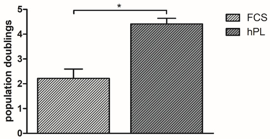 Cells cultured in 10% hPL-supplemented ESM had significantly (p < 0.01) more population doublings, with an average of 4.46 cumulative population doublings, than cells cultured in 10% FCS-supplemented ESM with an average of 2.22 cumulative population doublings (Figure 1).