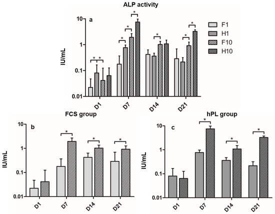 ALP activity kinetics differed among the four groups during the incubation period (Figure 2a). In the F1 group, ALP activity increased significantly from D1 to its maximum on D14, then remained on a stable level until D21, showing no significant differences between D14 and D21. The H1 group increased almost tenfold from D1 to D7, then decreased to D14 to further decrease until D21. The F10 group showed similar kinetics to the H1 group, but presented significantly different values to all time points. H10 showed its maximum ALP activity on D7, then significantly decreased to D14 to re-increase until D21. Differences between the F1 and H1 group were significant in the beginning of differentiation culture on D1 and D7, but showed no significant differences at D14 and D21. Differences between the H1 and the F10 group were significant at any time. Differences between the F10 and H10 group were significant on D7 and D21. In both hPL and FCS groups, cells incubated in the 10% supplemented media showed significantly higher ALP activity than the 1% groups on D7 to D21, but not on D1 (Figure 2b,c).