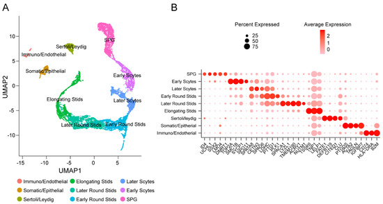 Single-cell transcriptome profiling from published adult human testes. (A) Uniform manifold approximation and projection (UMAP) clustering of combined adult human testicular cells from three individual samples. Nine major cell clusters were identified across a total of 16,632 cells. (B) Dot plot of proportion of cells in the respective cluster expressing selected marker genes (dot size), and average expression (color scale). SPG, spermatogonia; Early S’cytes, early spermatocytes; Late S’cytes, late spermatocytes; Early Round S’tids, early round spermatids; Later Round S’tids, later round spermatids; Elongating S’tids, elongating spermatids; Immuno, immune cells.