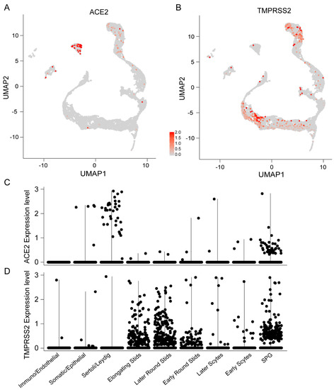 To determine the specific cell types expressing ACE2, we analyzed the RNA expression profile of ACE2 at single-cell resolution in human testes. Since we could not separate Leydig and Sertoli cells as distinct clusters, we combined these two somatic cell types together for subsequent analyses. The UMAP plot revealed that ACE2 was primarily enriched in two major clusters corresponding to spermatogonia and Leydig and Sertoli cells, as displayed in Figure 2A. A violin plot further demonstrated that ACE2 was highly expressed in spermatogonia and Leydig and Sertoli cells. Early spermatocytes, late spermatocytes, spermatids and other somatic cells had very low expression levels of ACE2, as displayed in Figure 2C. A recent study reported that SARS-CoV-2 uses the SARS-CoV receptor ACE2 for host cell entry, and the transmembrane serine protease 2 (TMPRSS2) for viral spike (S) protein priming [5]. Feature and violin plots indicated that TMPRSS2 expression was concentrated in spermatogonia and spermatids with relatively low levels in other cell types, as shown in Figure 2B,D. Thus, TMPRSS2 expression in spermatogonia and ACE2 expression in spermatogonia and Leydig and Sertoli cells suggest a high potential of SARS-CoV-2 infection in human testes.