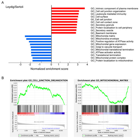 Characteristics of ACE2-positive Leydig and Sertoli cells. (A) Gene ontology enrichment analysis of biological process categories of ACE2-positive Leydig and Sertoli cells compared with ACE2-negative cells. (B) Examples of the enrichment plot for terms of cell–cell junction organization and mitochondrial matrix.