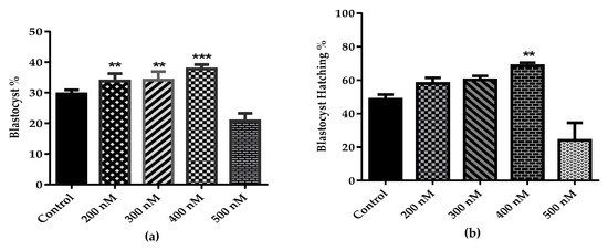 The 6-Bio (Sigma-Aldrich, Cat # B1686) was used to stimulate in-vitro maturation (IVM) and in-vitro culture (IVC) using Synthetic Oviductal Fluid (SOF) medium. Then, 5 mg powder of 6-Bio was dissolved in dimethylsulfoxide (DMSO) to a concentration of 2.8 mM and stored at −20 °C under light protected condition. Serial dilutions were prepared from stock solution. Cumulus Oocyte Complexes (COCs) were randomly placed in six groups (50-55 COCs per group). 6-Bio was added in each group in 700 µL-volume of culture medium to achieve the final concentration of 0 nM, 200 nM, 300 nM, 400 nM and 500 nM. Based on the bovine BL development and hatching rate, 400 nM dose was selected as the optimal concentration for subsequent experimental analysis. The study was conducted with 8 replicates.