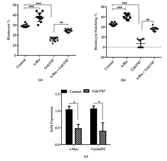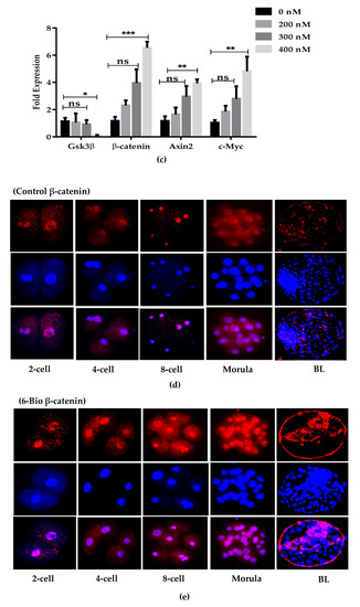 Previously, bovine BL microarray analysis has revealed that Wnt signaling components are present during the early developmental stages [8]. A recent study from the bovine embryos also demonstrated the prerequisite of Wnt/β-catenin signaling during the pre-implantation period by the manipulation with Wnt stimulator 2-Amino-4-(3,4-(methylenedioxy)benzylamino)-6-(3-methoxyphenyl) pyrimidine (AMBMP) and Wnt receptor antagonist Dickkopf-related protein 1 (Dkk1) [9]. Another study reported the activation of canonical Wnt signaling as early as the second cell stage of the pre-implantation period, which substantiates the importance of β-catenin dependent Wnt signal transduction [10,11,12,13]. This evidence suggests the role of Wnt signaling during the pre-implantation period. However, how this crucial signaling pathway regulates the development of bovine pre-implantation stages until the BL stage requires further investigation.