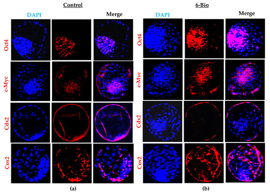 During early embryo development, the maintenance of cell proliferation event is regulated by the activation of several pluripotency factors and their interaction with the Wnt signaling cascade [34,35,36,37]. In this study exogenous stimulation of 6-Bio significantly induced the expression of core pluripotency markers such as Oct4 and c-Myc (Figure 2). The up regulation of these genes might help in the maintenance of pluripotency of ICM cells during BL formation. In parallel with the activation of Oct4 and c-Myc, the elevated β-catenin signaling suppressed the Cdx2 expression domain in the trophectoderm cells of developing BL (Figure 2). It has been reported previously that Oct4 and Nanog are required to suppress the expression domain of Cdx2 in the ICM cells [38,39]. Thus, in our results the significant up regulated expression of Oct4 protein in the ICM cells gives the possible explanation for the detectable loss in Cdx2 expression within the ICM. Although the Cdx2 expression was lost in 6-Bio treated embryos but it did not impair the BL formation rate. This might be due to the expression of upstream factors or of parallel to Cdx2 genes such as Tead4, Yap1, Gata3 and Elf5. These factors are adequately expressed in bovine trophoblast cells and initiates the trophectoderm differentiation [40,41,42].