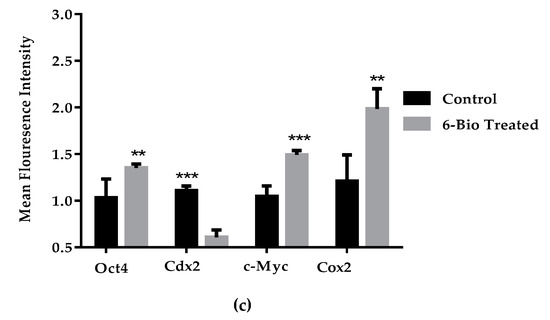 The functional importance of the Wnt signaling pathway during bovine embryonic development was characterized by analyzing several pluripotency and lineage specification markers. The expression of pluripotency maker Oct4 displayed a significant up regulation in the inner cell mass in the 6-Bio treated group (Figure 2A,B). Similarly, c-Myc, a target of the Wnt/β-catenin pathway was up regulated upon Wnt activation in the inner cell mass and trophectoderm of the bovine blastocyst (Figure 2A,B). The expression of trophoblast transcription factor, Cdx2 was downregulated by Wnt activation in the 6-Bio treated BL within the inner cell mass and trophectoderm layer. Cyclooxygenase-2 (Cox2) which promote the growth and hatching of the BL showed pronounced increase with the 6-Bio treatment (Figure 2A,B). qRT-PCR further confirmed the immunostaining analysis (Figure 2C). All these observations show the importance of Wnt signaling during the development of bovine embryos. It also suggests that the activation of Wnt signaling may exert a positive effect on the maintenance of pluripotency marker genes and may regulate the early stages of development.