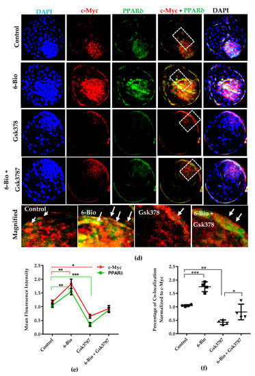 Different cancerous and developmental studies reported the cross-talk between Wnt/β-catenin pathway and the nuclear hormone receptor PPARs family [19,43]. PPARδ has been observed to regulate the BL development and implantation process in the mice uterus in response to Cox2 activation [44]. Here, we also observed that 6-Bio treatment remarkably increased the Cox2 expression (Figure 2). This result provided a link between PPARδ expression and Wnt signaling during bovine BL development. We demonstrated that activation of Wnt/β-catenin pathway by 6-Bio results in significant induction of PPARδ expression among the other PPAR family members (PPARα, PPARγ) (Figure 3A–D). These results affirmed the importance of Wnt induced PPARδ expression for the regulation of bovine BL development. Furthermore, we showed that PPARδ works in conjunction with Wnt activation to enhance the cell proliferation activity via stabilizing the strong co-localization with direct Wnt target gene c-Myc (Figure 4D), whereas its inhibition with GSK3787 decreased cell proliferation ratio. These results highlighted the necessity of PPARδ expression during Wnt activation and suggests that decreased cell proliferation activity interfere with the development of embryos to reach to the BL stage.