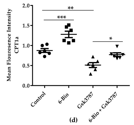 In the early embryonic development, the cell proliferation event is accompanied by several metabolic process. The most important of these metabolic processes is the lipid metabolism [29]. The ATP is generated by the fatty acid oxidation (FAO) during the early embryonic development and BL hatching [30]. Moreover, extensive reports show that PPAR family of transcription factors are known to regulate the expression of several key factors involved in FAO [15,30,31]. Based on these observations, we hypothesized that Wnt pathway may accelerate the BL hatching by the induction of PPARδ expression and FAO metabolism. We subsequently examined the expression of Cpt1 and Pdk4. These are the key regulatory genes involved in FAO and are the downstream targets of PPAR family of transcription factors. qRT-PCR analysis revealed that stimulation of Wnt significantly induced the expression of Cpt1 and Pdk4. Blocking of PPARδ function with Gsk3787 strongly reduced the expression of FAO related genes. The expression of these genes was restored by combination of Gsk3787 and 6-Bio (Figure 5A,B). Furthermore, the antagonistic effect of PPARδ inhibitor on Cpt1 expression was also confirmed by immunofluorescence analysis. These observations were consistent with qRT-PCR analysis (Figure 5C,D). These results suggested that Wnt signaling promote FAO metabolism by the upregulation of PPARδ signaling and accelerate BL hatching rate.