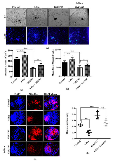 The effect of Wnt activation on lipid accumulation and invading ability of BL trophectoderm cells. (a) Fluorescent Nile probe (red) staining in control, Wnt agonist (400 nM), PPARδ antagonist (15 µM) and combination of agonist + antagonist treated groups. (b) Quantification of mean fluorescence intensities shown in the graph. (c) Bright field images showing the invasion area of BLs cultured in 6-Bio, Gsk3787 and 6-Bio + Gsk3787 supplemented medium. (d) Representative bar graph shows the mean invasion area analyzed by image J software. (e) Bar graph present the mean number of migrated cells. Nuclei are stained in blue in all images. Data presented as means ± SEM from triplicate sets of experiment, including n = 20 BLs per group in each replicate. * p < 0.05; ** p < 0.01; *** p < 0.001 indicates significant difference. Original magnification 100×.