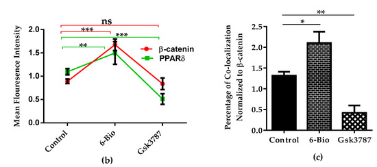 The stimulation of Wnt activity strongly enhanced the spatial overlapping of PPARδ with β-catenin while PPARδ was randomly overlapped with β-catenin in control group as shown by immune fluorescence analysis (Figure 7A). This result is consistent with previous study which showed that PPARδ can interact with β-catenin and promote Wnt/β-catenin mediated human colorectal cancer progression [19]. Reversibly, inhibition of PPARδ with Gsk3787 treatment significantly reduced its co-localization with β-catenin. The expression was restored eventually by the addition of 6-Bio (Figure 7A–C). The quantification analysis for the β-catenin and PPARδ expression positive cells has been shown in (Figure S4A,B). These results illustrated that Wnt upregulated the expression of PPARδ and enhanced its co-localization with β-catenin. This co-localization may make a transcriptional co-activator complex to promote the Wnt targeted genes expression and regulate bovine BL development.