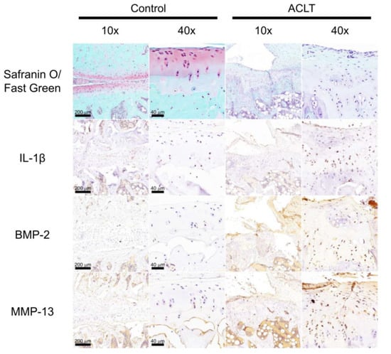 Previous research has reported high levels of BMP-2 expression in the knee OA intra-articular tissue [35,38,69]. To confirm that this phenomenon occurs in our OA animal model, we first studied the difference in histology between control rats and ACLT rats. Compared with control rats, we found that ACLT rats had a significant articular cartilage degradation and destruction of the knee articular surface (according to Safranin O/Fast Green staining) and significantly increased expression of IL-1β, BMP-2, and MMP-13 (according to IHC staining) (Figure 1).