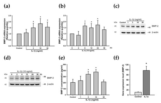 IL-1β induces BMP-2 expression in chondrocytes. (a,b) ATDC5 cells were incubated with different doses of IL-1β (0, 1, 3, 10, or 30 ng/mL) for 24 h, or with IL-1β (10 ng/mL) for the indicated times (0, 2, 6, 12, 24, or 36 h), and BMP-2 mRNA expression was evaluated by qPCR (both n = 6). Statistical testing was performed by one-way ANOVA. (c,d) ATDC5 cells were incubated under different concentrations of IL-1β for 24 h, or for the indicated times, and BMP-2 protein expression was evaluated by Western blotting (both n = 6). (e) ATDC5 cells were incubated with different doses of IL-1β (0, 1, 3, 10, or 30 ng/mL) for 24 h, and BMP-2 protein secretion was evaluated by ELISA (n = 6). Statistical testing was performed by one-way ANOVA. (f) IL-1β induced BMP-2 expression in the articular cartilage; BMP-2 gene expression was obtained from the GEO database. Statistical testing was determined by the Student’s t-test. Quantification results are expressed as the mean ± SD. * p < 0.05 compared with the Control group in (a,e,f), and compared with the 0 h group in (b). Abbreviations: IL-1β: Interleukin 1 beta; BMP-2: Bone morphogenetic protein 2; qPCR: Real-time quantitative polymerase chain reaction; GEO database: Gene Expression Omnibus database.