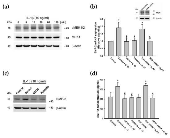 Mitogen-activated protein kinases (MAPKs) are believed to play key regulatory roles in the production of various proinflammatory cytokines and downstream signaling events in processes leading to inflammation and articular cartilage destruction [71,72]. Therefore, we sought to determine whether MEK (a MAPK upstream activator) is involved in IL-1β-induced BMP-2 expression, by measuring levels of pMEK at different time intervals. The results revealed that IL-1β time-dependently enhanced MEK phosphorylation (Figure 3a). Pretreatment of ATDC5 cells with MEK inhibitors (U0126 and PD98059) or MEK siRNAs attenuated IL-1β-induced BMP-2 expression (Figure 3b–d).