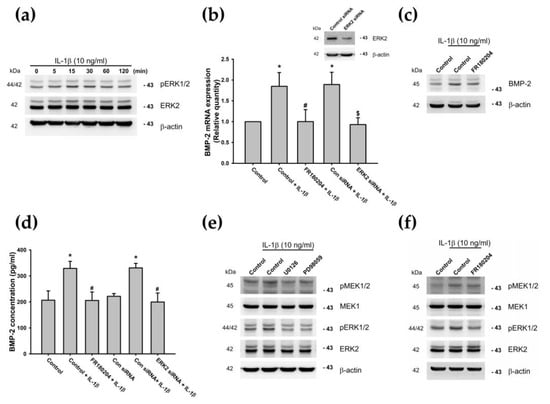 Previous studies have suggested that IL-1β can be linked to the OA disease process by activating the MEK/ERK cascade [48,73,74]. Next, we examined ERK phosphorylation, to determine whether ERK signaling plays a role in IL-1β-induced BMP-2 expression. After 15 min of IL-1β (10 ng/mL) treatment, we found that levels of ERK phosphorylation increased in a time-dependent manner (Figure 4a). Conversely, IL-1β-induced BMP-2 expression was attenuated by pretreatment with an ERK inhibitor (FR180204) or by transfecting cells with ERK siRNAs (Figure 4b–d). Furthermore, we confirmed a relationship between the MEK and ERK signaling pathways. Incubating the ATDC5 cells with the MEK inhibitor reduced IL-1β-induced MEK and ERK phosphorylation (Figure 4e), but did not affect MEK phosphorylation when an ERK inhibitor was used (Figure 4f). Our data suggest that the MEK and ERK pathways are involved in IL-1β-induced BMP-2 expression in chondrocytes.