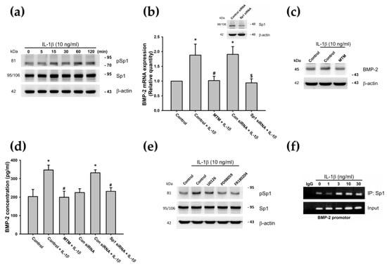 The inhibition of Sp1 downregulates catabolic gene expression and reduces proinflammatory cytokine-induced production of ECM degradation enzymes [56,75]. Moreover, it appears that Sp1 stimulates the transcription of the BMP-2 gene [57]. Therefore, we examined whether Sp1 is involved in IL-1β-induced BMP-2 production, by analyzing Sp1 phosphorylation following IL-1β stimulation. The results demonstrated that treatment of ATDC5 cells with IL-1β (10 ng/mL) increased Sp1 phosphorylation in a time-dependent manner (Figure 5a). We also confirmed that pretreatment with the Sp1 inhibitor (mithramycin A) or transfection of cells with Sp1 siRNAs decreased IL-1β-induced BMP-2 mRNA levels and protein production (Figure 5b–d). To determine whether Sp1 is a downstream effector of the MEK/ERK pathway, the inhibitors of MEK (U0126 and PD98059) and ERK (FR180204) were used. Phosphorylation of Sp1 was observed in the Western blot analysis. Pretreatment with MEK or ERK inhibitors reduced IL-1β-induced Sp1 phosphorylation (Figure 5e). Moreover, we confirmed with the ChIP assay data that Sp1 binds to the BMP-2 promotor binding site after IL-1β (0, 1, 3, 10, or 30 ng/mL) stimulation, in a concentration-dependent manner (Figure 5f). These data suggest that IL-1β promotes BMP-2 expression in ATDC5 cells through the MEK/ERK/Sp1 signaling pathways.