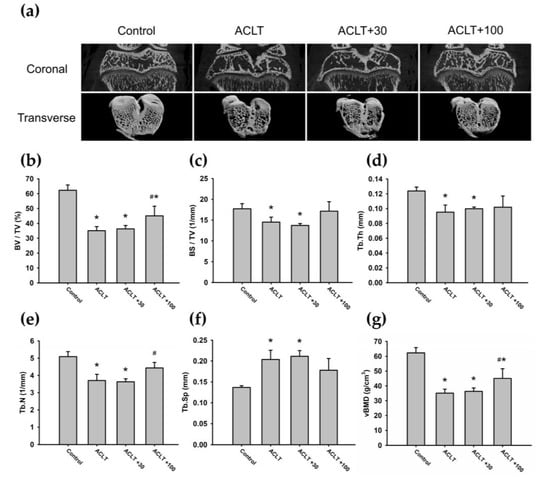 Then, we investigated whether BMP-2 inhibition could reverse the OA disease in vivo, using the rat ACLT model. Micro-CT analyses of coronal and transverse planes are shown in Figure 6a. All rats showed pathological tibial subchondral bone changes in the ACLT knee joint, particularly in the ACLT group and ACLT+30 group (Figure 6a). In each group, the ROI microarchitectural parameters were measured individually. The micro-CT data revealed significant reductions in the BV/TV fraction and vBMD in all ACLT animals compared with the control group (Figure 6b,g). Moreover, BS/TV, Tb.Th, and Tb.N measurements in the ACLT and ACLT+30 groups were significantly lower than those in the control group (Figure 6c–e). Furthermore, Tb.Sp was significantly increased in the ACLT group and ACLT+30 group compared with the control group (Figure 6f). Interestingly, there were no significant differences between the ACLT+100 group and control group for BS/TV, Tb.Th, Tb.N, and Tb.Sp measurements (Figure 6c–f). Furthermore, we found that the ACLT+100 group had higher BV/TV, Tb.N, and vBMD measurements compared with those in the ACLT and ACLT+30 groups (Figure 6b,e,g). Our findings suggest that OA-induced subchondral bone changes can be attenuated by intra-articular injections of BMP-2 inhibitors.