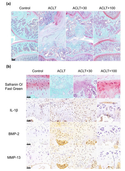 Similarly, Safranin O/Fast Green staining revealed a significant articular cartilage erosion and destruction of the knee joint in the ACLT and ACLT+30 groups, as characterized by proteoglycan loss, chondrocyte clusters, and degenerative changes in the cartilage matrix (Figure 7a,b). Moreover, IHC staining of the knee joints revealed significantly increased levels of IL-1β, BMP-2, and MMP-13 expression in the ACLT and ACLT+30 groups; these levels were markedly diminished in the ACLT+100 group (Figure 7b).